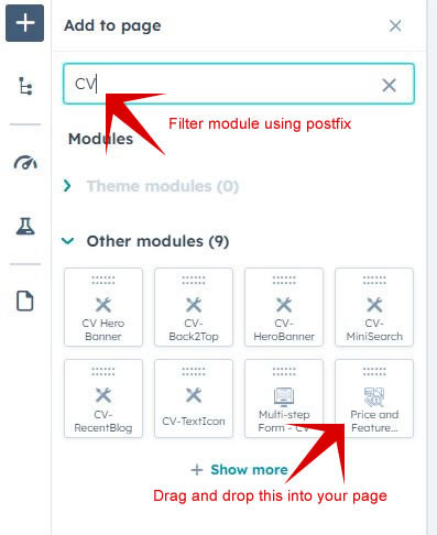 After installing the module, you're ready to integrate it into your HubSpot pages. Our module carries the postfix "CV" to distinguish it from similar modules, allowing you to filter those that originate from us.
