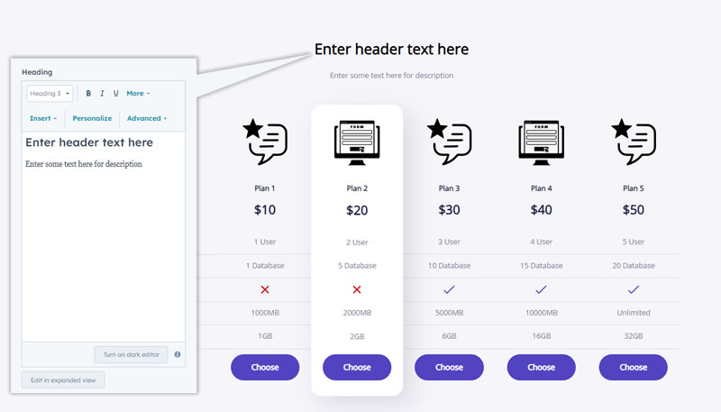 Introducing the dynamic "Price and Feature Comparison" module, a powerful tool within HubSpot's suite designed to revolutionize how you showcase your product or service offerings. This versatile module empowers you to present a comprehensive breakdown of your different plans side by side, allowing your customers to make informed decisions effortlessly.