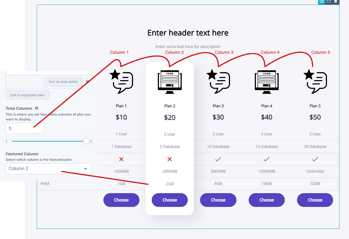- Multi-Column Flexibility: The module's layout supports up to five columns, providing you with ample space to display various plans or offerings in a structured manner. This enables seamless comparison and helps your customers quickly identify the features that matter most to them.