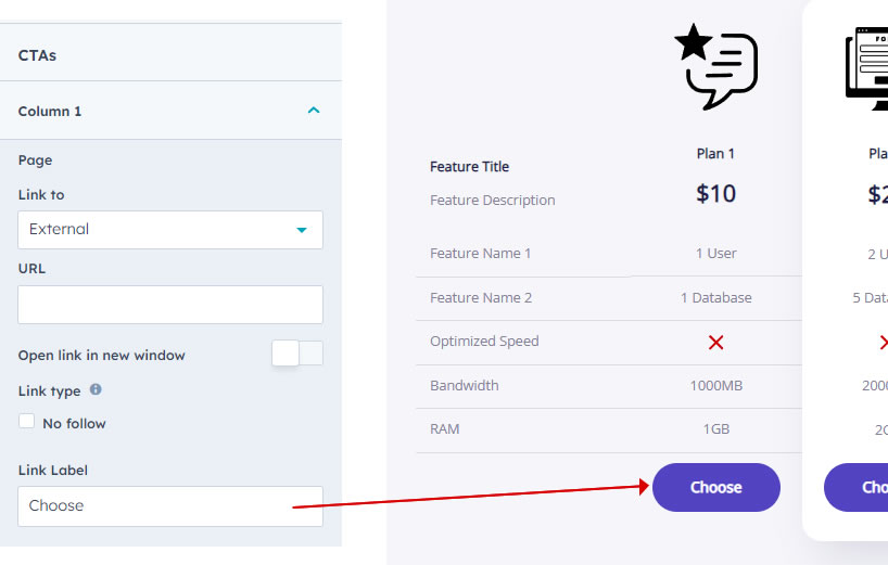 If CTA has been enabled, CTAs group field will be displayed for you to add a button for each column.