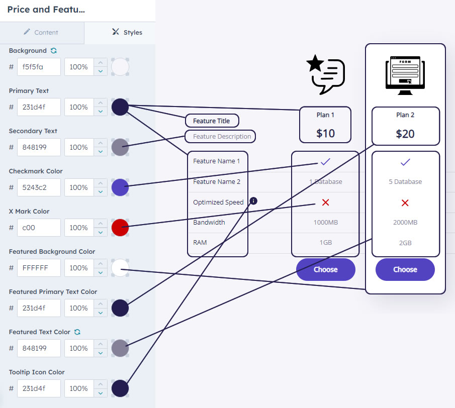 - Featured Primary Text governs the color of plan names and pricing information within the featured column.
